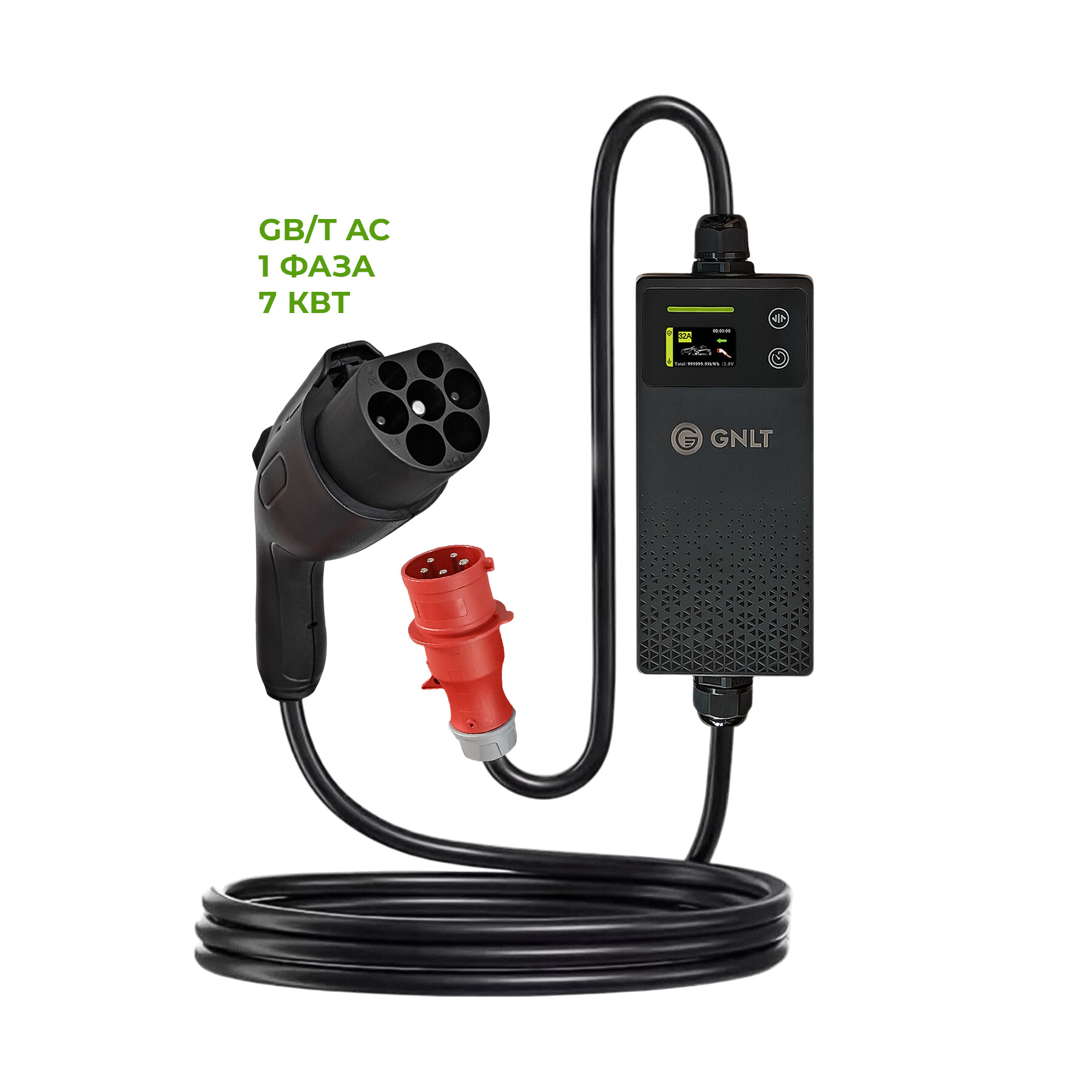 GNLT EVX с коннектором GB/T — это переносное зарядное устройство переменного тока мощностью до 7 киловатт, созданное для бытовой зарядки китайских электромобилей.